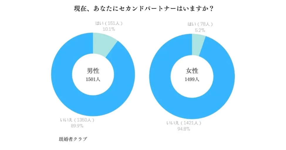 既婚者マッチングアプリ「既婚者クラブ」の調査によると、全体の約8%が「セカンドパートナーがいる」と回答。