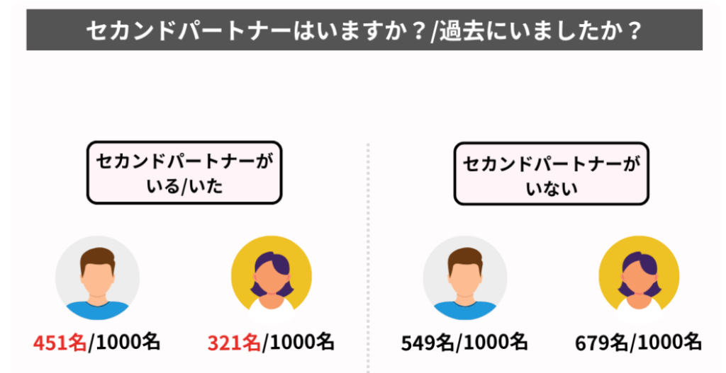 また、別の調査(既婚者マッチングアプリ-既婚マッチ調べ)では「セカンドパートナーを持ったことがある」と答えた人は男性45%、女性32%と高い割合を示す結果も。