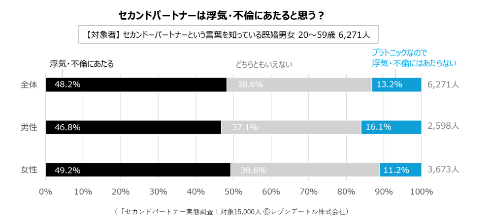 「セカンドパートナーは浮気や不倫にあたる」と考える人は、男女ともに約半数(男性47%、女性49%)。
